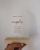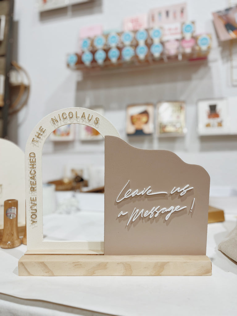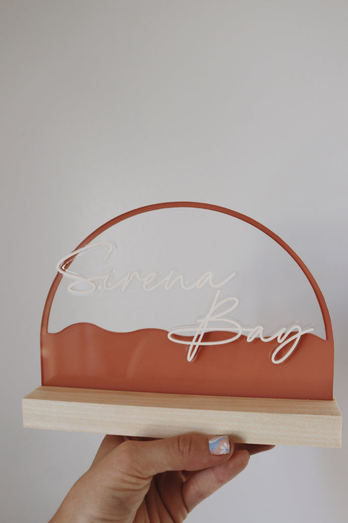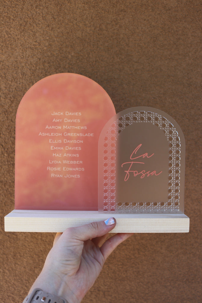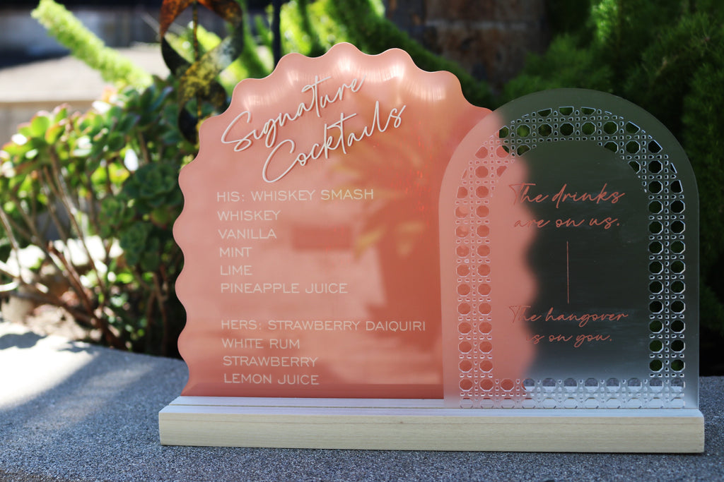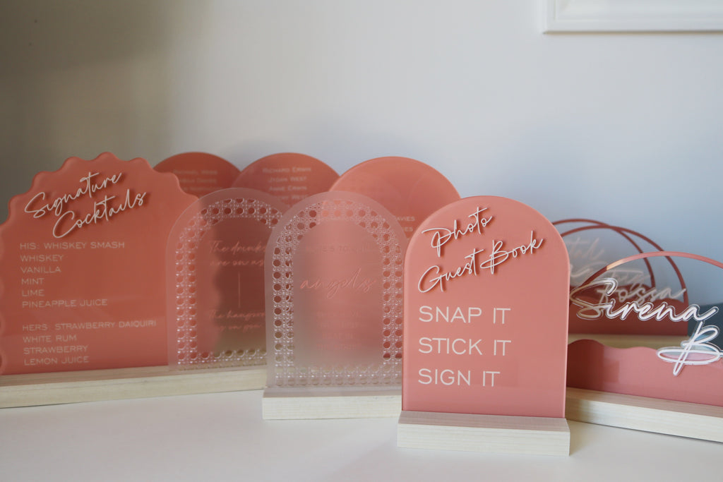 Each piece is laser cut, personalized, and available in clear, frosted, or colored acrylic, as well as natural wood finishes. Perfect for modern, boho, or rustic weddings.